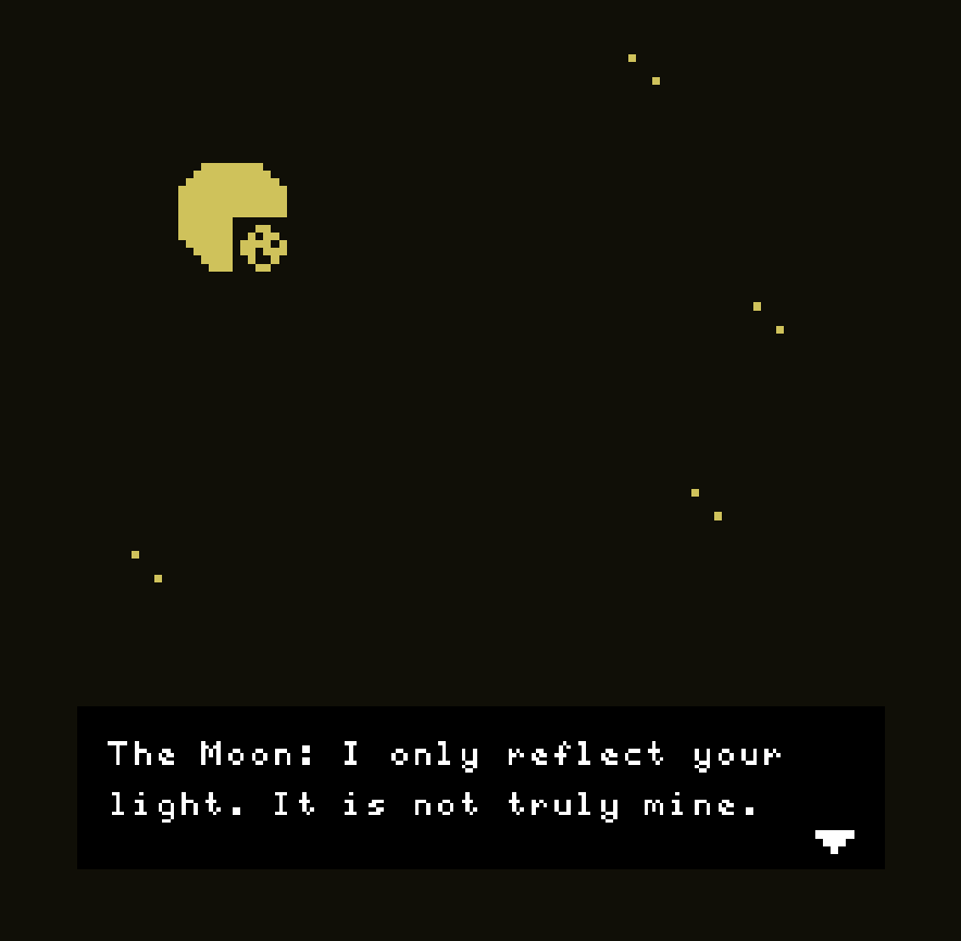 A short narrative game about the Moon's journey to Earth. In the face of the vastness of space, even the Moon gets lonely sometimes. Follow the Moon as she finds her purpose.